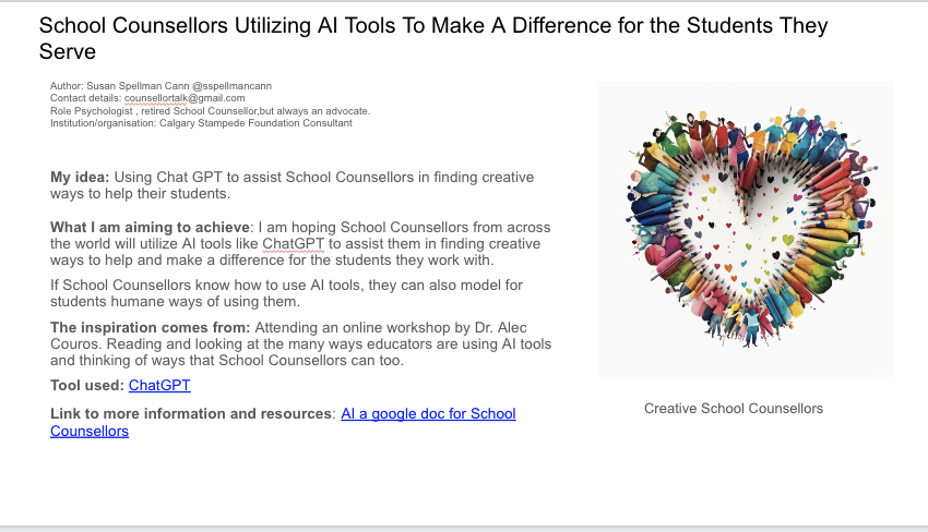 Check out this how to guide: where you will find an open invitation to all educators and students to co-create a collection of ideas on how AI tools such as chat GPT, DALL-E and Midjourney could be used in inventive ways for teaching , learning and scholarship. If you are a School Counsellor take a look at Slide #50.
